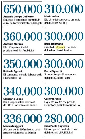 Sul tema degli sprechi e della gestione del carrozzone RAI sono stati scritti articoli-inchiesta e tomi molto dettagliati che, tuttavia, anziché portare a radicali modifiche di quel pseudo servizio pubblico, aldi là di qualche annuncio di facciata, e di una farlocca vigilanza, hanno consentito di continuare nella gestione Cesaria, incrementando le assunzioni, le parcelle e le prebende per i dipendenti. Ricordo, fra i vari scritti, un libro illuminante –datato, ma estremamente attuale-sulle nefandezze della RAI, dal titolo emblematico ‘’RubeRai’’; una sorta di inchiesta condotta da Bechis, puntava il dito sull’inefficienza fallimentare di quell’azienda e sugli sprechi trasversali da sempre esistenti. Dagli abnormi emolumenti concessi a pioggia a dipendenti e consulenti, alla scadente professionalità degli organici, al paradossale incremento ad ogni cambio di management, alle elargizioni a piene mani a personale esterno all’azienda chiamato a fare qualche misero programma e, per finire, scarso, intempestivo, quando non partigiano servizio pubblico fornito da ‘’mamma Rai’’. Cioè un’azienda in rosso sotto ogni profilo, che di servizio pubblico faceva – e fa, purtroppo- davvero poco e male, nonostante il cospicuo ed ingiusto canone esborsato dal cittadino, cui si sommano le prebende pubblicitarie presenti ormai nella stessa misura di altre TV private. Uno stipendificio per pochi eletti, prima indicati dai partiti per un fariseo pluralismo, ora in modo monotematico, dal Governo, a cui si sommano i raccomandati, col fenomeno imperante del clientelismo o anche del più spregiudicato familismo (provate a vedere nei crolls i nomi dei vari inviati e noterete qualche omonimia con cognomi famosi dello ‘’scatolone nero’’). Nonostante il Paese sia in crisi ed il lavoro manchi, alla RAI si va a gonfie vele, tant’è che un nugolo incredibile di dirigenti e giornalisti ‘’fortunati’’ di via Mazzini continuano a percepire stipendi extra large, smisuratamente large ed immotivati; lo scandalo è duplice: un centinaio di stipendi superiori al famigerato ‘’tetto’’ stabilito dal governo per i dipendenti pubblici, con una serie di servizi e di ‘’operatività’’ che fanno pena! Per superare l’impasse del ‘’tetto’’ sembra che quelli di via Mazzini siano diventati anche imprenditori privati in modo da by-passare quel fastidioso limite superiore stipendiale: ora è tutto legale, ma palesemente illegittimo visto che quei soldi sono frutto di un palese raggiro, orchestrato. Non è, per caso, che addirittura non si applica a quei ‘’paperoni’’ neppure quel ‘’premio di solidarietà’’ a cui debbono soggiacere tutti i dipendenti pubblici per compensare l’welfare, ridistribuirlo ai meno abbienti, ultra-tassando con quel 6, 12 o 18%, a seconda dell’entità degli emolumenti, o pensione, comunque per una solidarietà opinabile e dettata per legge? Una verifica sarebbe più che doverosa, ma nessuno ne parla! Tutti d’accordo, politici, giornalisti, direttori: l’importante è trovare il sistema per mettersi i soldi del cittadino – e tanti- in tasca, poi che il servizio sia di buon livello o meno, è un optional. Se dipendesse da molti la RAI potrebbe chiudere i battenti, altro che tenere in piedi tre reti e varie altre nate solo per soddisfare le gole profonde e non certo sulla base di meriti, e della ‘’customer satisfation’’ che non c’è! Nonostante i proclami dei vari direttori e presidenti che si sono alternati negli ultimi 30 anni, la compagine RAI continua a lievitare, lievitano i compensi sia di chi è in organico ma anche di esterni ed ex (si paga anche chi non ha incarico!!): ciò che stenta a lievitare è la qualità dei servizi (ora abbiamo su RAI 1 ‘’teche-techè-tè’’, uno sconcio che solo la ‘’mamma’’ ha l’ardire di trasmettere…) e la prontezza nell’informazione (mentre su altri canali quando succede l’imprevisto c’è subito uno speciale, la RAI va in onda anche con gli attentati o le catastrofi con tutta calma, dopo ore o giorni…). Un altro tomo illuminante sugli sprechi italici fu scritto dall’onorevole Costa ormai quasi vent’anni fa; fra quelli più eclatanti, trasversali e quindi a prescindere dal colore politico del governo pro-tempore, figuravano quelli della RAI con paginate di nomi di alcuni noti personaggi (da Baudo a Giurato, e via dicendo con compensi dell’ordine del miliardo di lire) cui si sommavano una sterminata sfilza di questuanti (ora andrebbe aggiunto pure quel ‘’famoso’’ Marrazzo, rientrato dalla porta di servizio, quale corrispondente estero con lauto stipendio, perché la ‘’mamma’’ non abbandona mai nessuno…) che godevano di prebende non inferiori ai 200 milioni (i più sfigati): ora, con una strana bacchetta magica si sono trasformati, grazie alla ben nota divisa europea, in milioni di euro per i primi e corrispondenti centinaia di migliaia di euri per quegli altri. E poi i nostri governanti hanno il coraggio (meglio la spudoratezza..) di promuovere la spending review (sempre invocata e mai realizzata..) per dar da bere agli allocchi che si eliminano gli sprechi? E’ esattamente la stessa litania del referendum costituzionale autunnale che, se si vota affermativamente, produrrà le riforme necessarie per il Paese, e servirà – secondo quanto dichiarato dalla Boschi- anche a combattere il terrorismo: nient’altro? Demagogia e populismo, improvvisazione e annuncite sono gli ingredienti del nostro tempo, con una buona dose di scaltrezza e di arrivismo ad ogni costo: a loro interessa solo il potere, la cadrega, i soldi, mentre il resto poco importa.