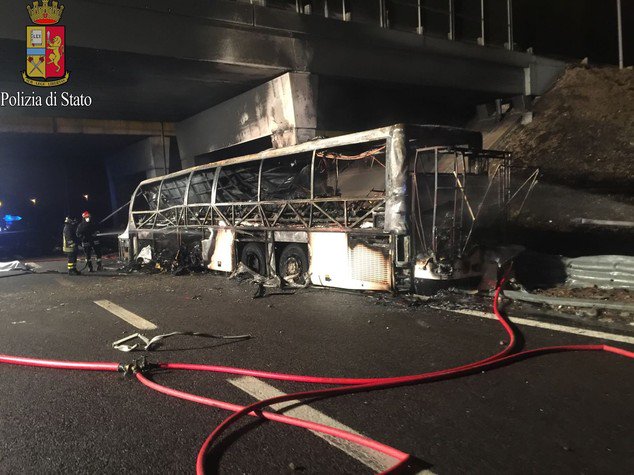 E’ successo sull’autostrada A4, nelle vicinanze dello svincolo per Verona Est: un autobus ungherese ha preso fuoco dopo che il conducente ha perso il controllo ed è finito contro un pilone. Sono 16 le persone morte. Vigili del fuoco e mezzi di soccorso sono impegnati sul luogo. I feriti sono stati trasportati nei nosocomi della città scaligera.