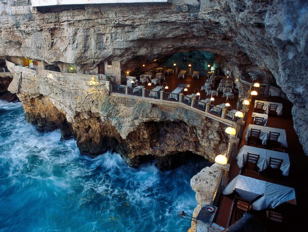 Uno tra tutti è certamente “Grotta Palazzese”: è stato definito il ristorante più bello del mondo e si trova a Polignano a Mare, in provincia di Bari. L’intero locale è situato all’interno di una vera e propria grotta e i tavoli si affacciano sul mare, in una location ariosa e magica che rende questo ristorante uno dei più romantici della penisola. Il buon cibo non è certo da far passare in secondo piano, ma i tavoli che si riversano su uno strapiombo marino dalla vista mozzafiato gli danno sicuramente quel tocco in più.