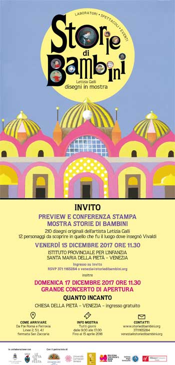 Il progetto espositivo di Letizia Galli, costituito da 12 storie tratte dai suoi libri e 210 disegni originali che approfondiscono la conoscenza di ciascun personaggio, sarà a Venezia dal 16 dicembre 2017 fino al 15 aprile 2018. Dopo le tappe di Napoli e Firenze raggiungerà ora la laguna per condividere storie avvincenti i cui protagonisti sono bambini che sognano, sperano e desiderano un futuro migliore portando così un messaggio di accoglienza, forza e speranza.