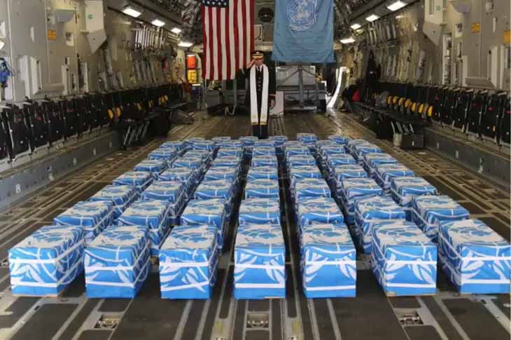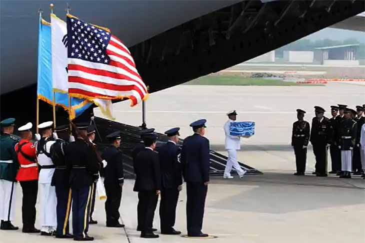 Un aereo militare C-17 della US Air Force è decollato da Wonsan, in Corea del Nord, con a bordo i feretri contenenti i resti dei militari caduti durante il conflitto del 1950-53. Ad attenderlo, sulla pista della base militare Usa di Osa, in Corea del Sud, un picchetto d’onore, che ha reso omaggio alle urne avvolte nella bandiera delle Nazioni Unite.