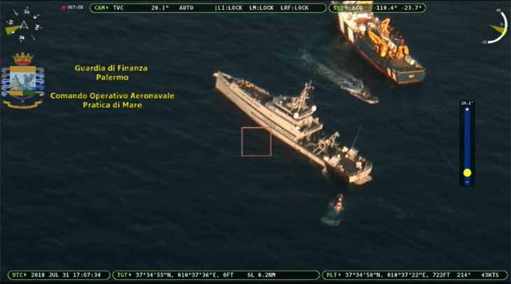 All’atto dell’abbordaggio, il comportamento sospetto del Comandante della nave e dell’equipaggio, i quali non sono stati in grado di fornire chiare spiegazioni in merito alle proprie attività in mare ed alla propria destinazione, spingevano i militari a scortare il natante presso il porto di Palermo, anche in relazione alla presenza a bordo di 18 serbatoi contenenti complessivamente circa 400.000 litri di gasolio, i quali non potevano essere