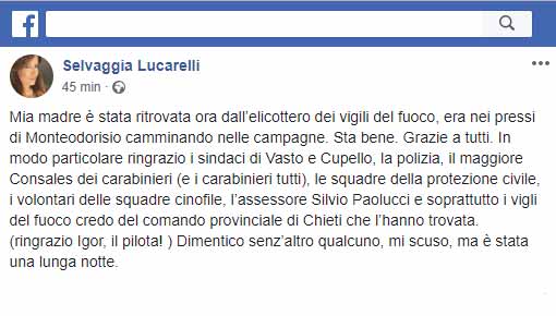 Aggiornamento ore 11 – Buone notizie: la mamma di Selvaggia Lucarelli è stata rintracciata e sta bene. E’ la stessa Selvaggia a dichiararlo “Mia madre è stata ritrovata ora dall’elicottero dei vigili del fuoco, era nei pressi di Monteodorisio camminando nelle campagne. Sta bene. “. Allarme dunque rientrato.