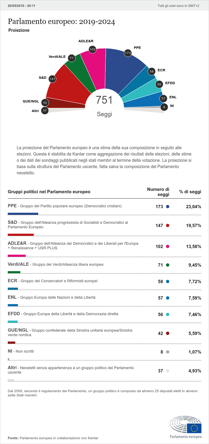 Queste proiezioni si basano su exit poll pubblicati in 11 paesi (Austria, Cipro, Germania, Irlanda, Malta, Paesi Bassi, Bulgaria, Croazia, Francia, Danimarca, Slovacchia) e su sondaggi preelettorali nei restanti 17 Stati membri. Le proiezioni dei seggi saranno aggiornate nel corso della notte, con le stime e i risultati ufficiali che arriveranno dagli Stati membri. I primi risultati globali provvisori sono attesi per le 23:15 circa.